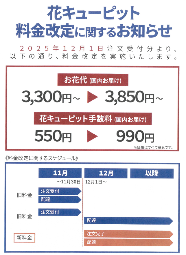 花キューピットは、2025年12月1日注文受付分より手数料改定となります。